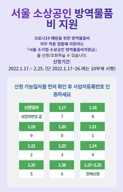 서울만 지원하는 것이 아닙니다. 사업장 소재지에 시·군·구 공식 홈페이지를 통해서 방역물품 지원 대상 여부 조회 및 신청이 가능합니다.