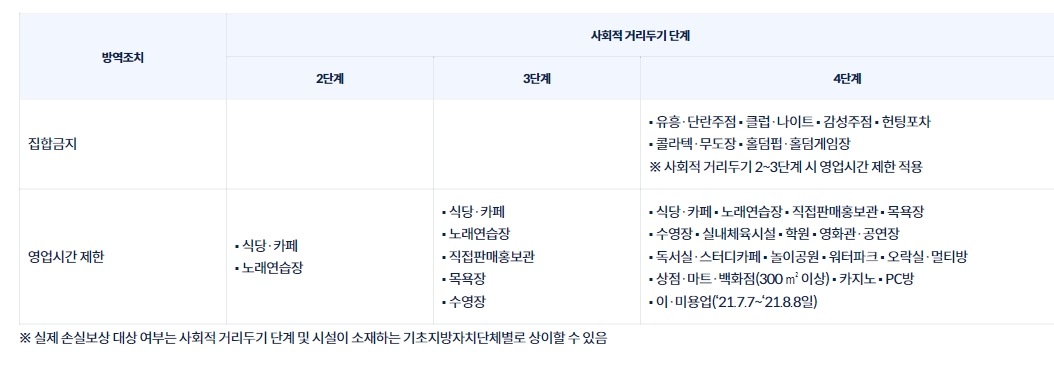 실제 손실보상 대상 여부는 사회적 거리두기 단계 및 시설이 소재하는 기초 지방 자차 단계 별로 상이할 수 있습니다. 아래 표를 통해서 대상 범위에 해당되는지 다시 한번 확인해보세요.