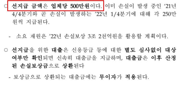 대상 업체당 모두 동일하게 500만 원이 지급됩니다. 별도 심사 과정이 없이 대상 여부만 확인되면 지급기간 내에 빠르게 지급할 예정입니다. 그렇기 때문에 더욱 손실 보상을 선지급하는 것이 중요합니다.
