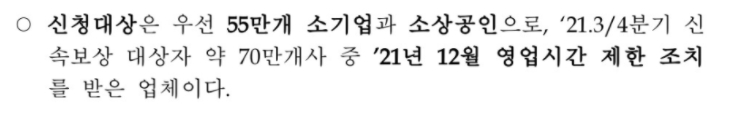 우선 대한민국에55만 개의 소기업 및 소상공인을 대상으로 합니다. 2021년 3~4분기(2021년 7월 7일 ~ 2021년 9월 30일) 대상자 중 2021년 12월 영업시간 제한(방역 패스) 조치를 받은 업체를 우선으로 선정됩니다.
