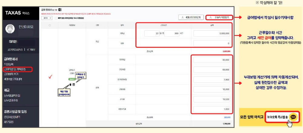 이용 방법은 상당히 간단합니다. 카카오톡으로 로그인하고, 직원 등록 그리고 급여 사항에 대해서 입력하고 발송하기만 하면 됩니다. 물론 그전에 미리 준비해야 하는 사항이 있습니다.