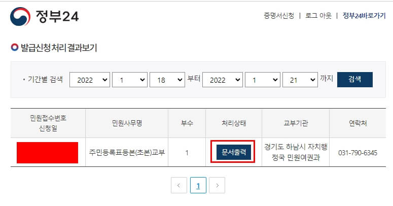 이제 거의 다 왔습니다. 주소 입력하셨다면 다음으로 아래와 같은 화면으로 이동하게 됩니다. 여기서 "문서 출력" 버튼을 클릭해주세요.