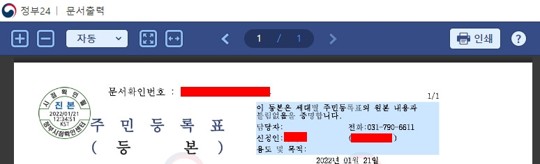 문서 출력 화면에서 정상적으로 주민등록등본이 발급되어 있는지 내용을 확인해보세요. 그리고 정보가 맞다면 "인쇄" 버튼을 클릭해주세요. 프린트가 없다면, 파일로 저장하기 위해서 PDF 항목을 선택하고 저장하기 하시면 정상적으로 발급됩니다.