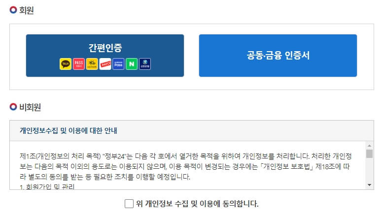 메뉴를 클릭하시면 다음과 같이 로그인할지 비회원을 할지 선택하는 화면이 노출됩니다. 만약 회원이라면, 간편 인증과 공동 금융인증서(공인인증서) 두 가지 방법 중에 당신이 편한 방법을 선택하시면 됩니다.