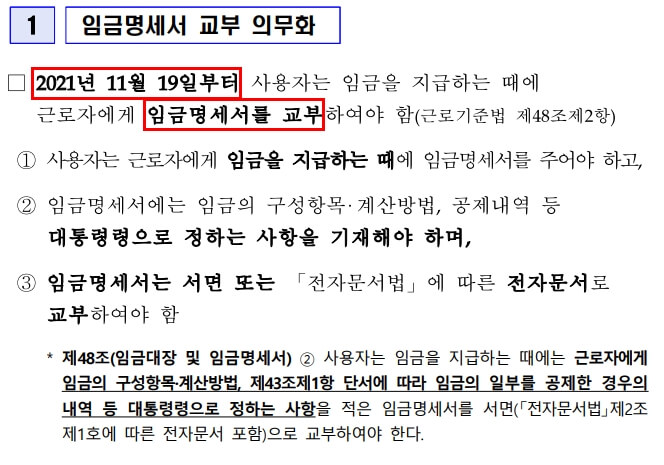 대한민국에 주요 법은 주기적으로 변경이 됩니다. 그리고 2021년 11월 근로기준법 개정으로 급여명세서 교부가 의무화로 변경되었습니다.